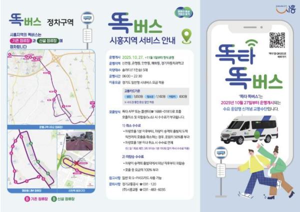 시흥시 똑버스는 이달 10월 27일부터 31일까지는 무료로 시범 운행되며, 내달 1일부터 정식 운행개시 될 예정이다.