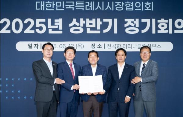 대표회장인 이재준 수원시장을 비롯한 5개 시 특례시장(창원시는 시장 권한대행)은 12일 화성시 전곡항 마리나클럽하우스에서 열린 대한민국특례시시장협의회 2025 상반기 정기회의에서 건의문에 서명했다. 특례시시장협의회는 행정안전부 장관 등에게 건의문을 전달할 예정이다.