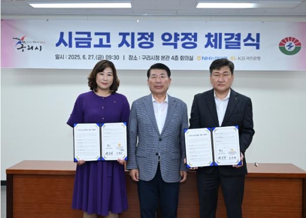 구리시는 27일 NH농협은행 구리시지부 및 KB국민은행 구리종합금융센터와 시금고 업무 취급을 위한 약정식을 체결했다.