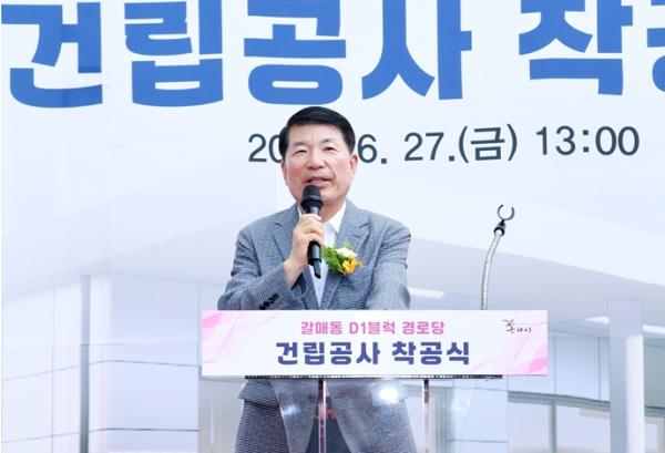 구리시는 지난 27일 갈매동 551번지에서 '갈매동 D1블럭 경로당 건립공사'의 착공식을 개최했다.