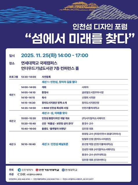 인천광역시는 오는 11월 25일 연세대학교 국제캠퍼스에서『인천섬 디자인 포럼』을 개최한다고 밝혔다.