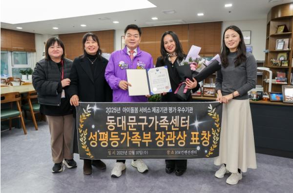동대문구가족센터는 10일 열린 ‘아이돌봄서비스 소통의 날’ 행사에서 ‘2025년 아이돌봄서비스 제공기관 평가’ 결과를 바탕으로 장관상을 받았다. 이번 평가는 전국 225개 아이돌봄서비스 제공기관을 대상으로 이용자 만족도, 서비스 운영 성과, 아이돌보미 확보 및 활동 참여도 등을 종합 심사해 우수기관을 선정했다.