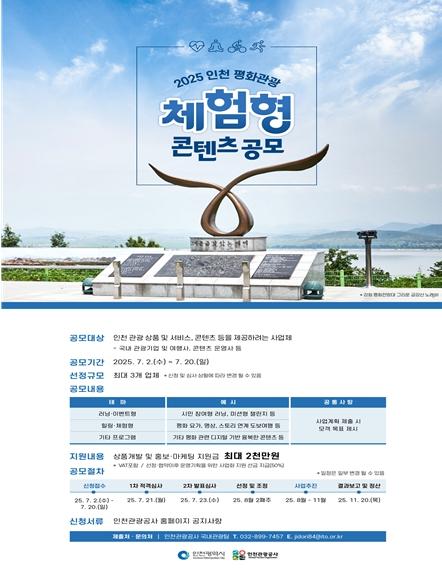 인천광역시와 인천관광공사는 인천의 대표적인 평화 관광지를 널리 알리고, 새로운 관광 수요를 창출하기 위한 ‘2025 인천 평화관광 체험형 콘텐츠 공모전’을 7월 2일부터 20일까지 개최한다고 밝혔다.