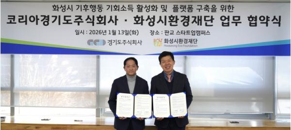 경기도주식회사는 13일 경기도 성남시 판교 스타트업캠퍼스에서 화성시환경재단과 ‘기후행동 기회소득 활성화 및 화성시 플랫폼 구축을 위한 업무협약’을 체결했다.
