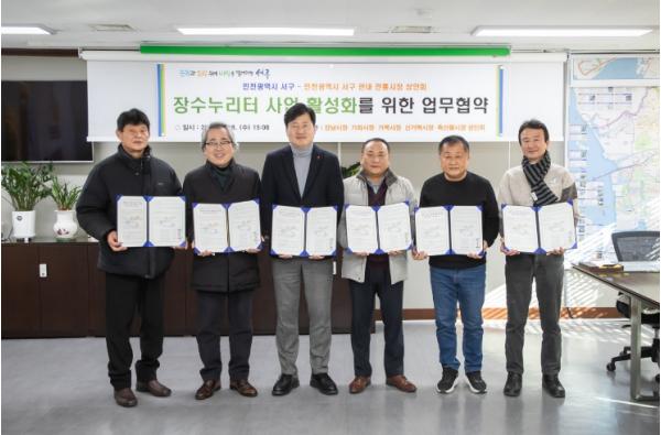 인천 서구는 지난 28일 인천광역시 서구 전통시장 상인회와 서구민의 건강한 노후를 지원하고 지역사회 돌봄 체계를 구축하기 위한 ‘장수누리터 사업 활성화’ 업무협약을 체결했다.
