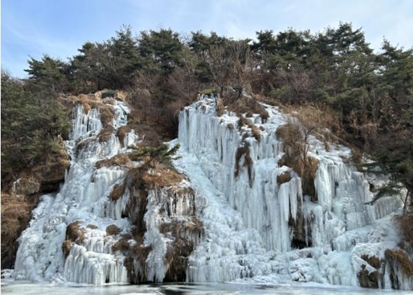 올겨울 홍제폭포는 가로 60m, 세로 25m에 달하는 거대한 은빛 빙벽으로 옷을 갈아입으며 역대급 절경을 선보이고 있다. 사진 속 빙벽은 깎아지른 듯한 암벽을 따라 수천 개의 고드름이 겹겹이 층을 이루며 거대한 얼음 조각품을 연상시킨다. 폭포수가 흐르던 자리를 가득 채운 투명한 얼음 기둥들은 겨울 햇살을 받아 보석처럼 빛나며 보는 이의 탄성을 자아낸다.