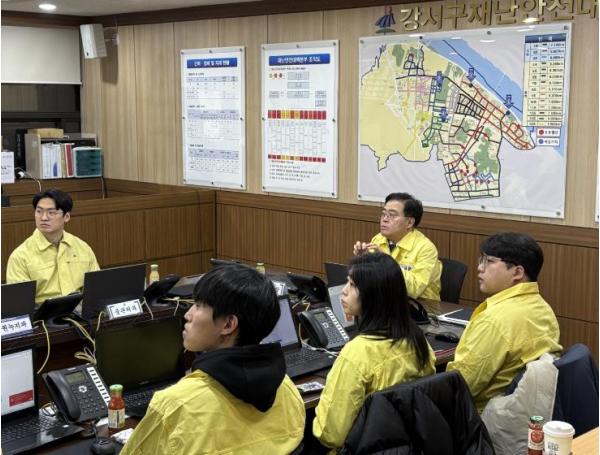진교훈 서울 강서구청장이 1일 밤부터 2일 새벽 사이에 서울 전역에 많은 눈이 내릴 것이 예보됨에 따라 구 제설대책본부를 찾아 제설대응 체계를 점검했다.