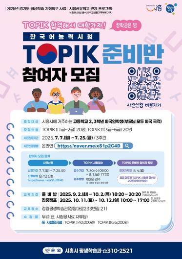 시흥시는 2025년 경기도 평생학습 기회특구 사업의 일환으로, 관내에 거주하는 고등학교 2~3학년 외국인 학생을 대상으로 ‘한국어능력시험(TOPIK) 준비반’을 운영한다.
