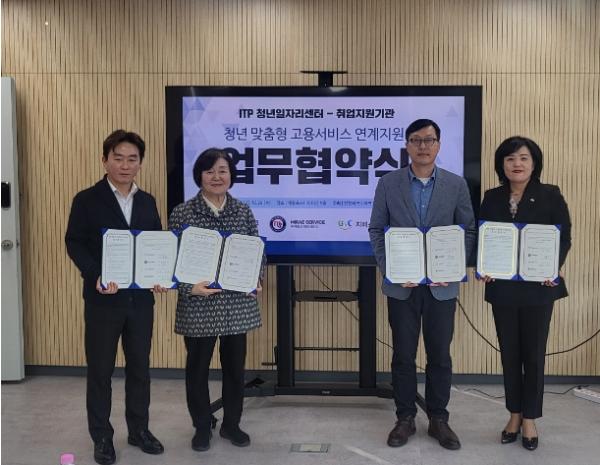 인천테크노파크(인천TP)는 지난 29일 제물포스마트타운에 있는 인천광역시 청년지원센터 유유기지에서 민간 취업지원기관 ㈜미래서비스, ㈜지에스씨넷, ㈜휴먼잡트러스트와 ‘청년 맞춤형 고용서비스 연계지원 업무협약(MOU)’을 체결했다.