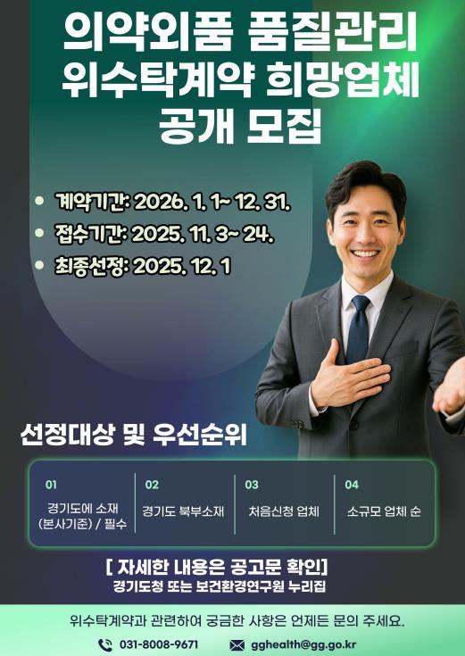 경기도보건환경연구원은 오는 24일까지 ‘2026년 의약외품 품질검사 위·수탁계약’ 참여를 희망하는 제조·수입업체를 모집한다.