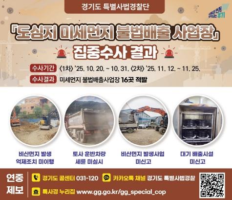 경기도는 도심지 미세먼지 발생사업장 330개를 대상으로 불법 배출 행위를 집중 수사해 대기환경보전법 위반 사업장 16개를 적발했다고 9일 밝혔다.