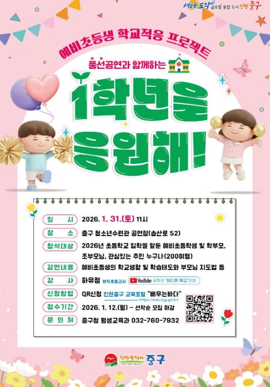 인천시 중구는 새 학기를 앞두고 오는 31일 오전 11시 영종국제도시 소재 중구청소년수련관 공연장에서 ‘예비 초등생 학교적응 프로젝트 - 1학년을 응원해!’를 개최한다고 밝혔다.