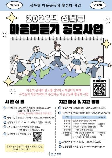 서울시 성북구는 마을공동체 활성화를 위해 '2026년 성북구 마을만들기 공모사업'을 진행한다.