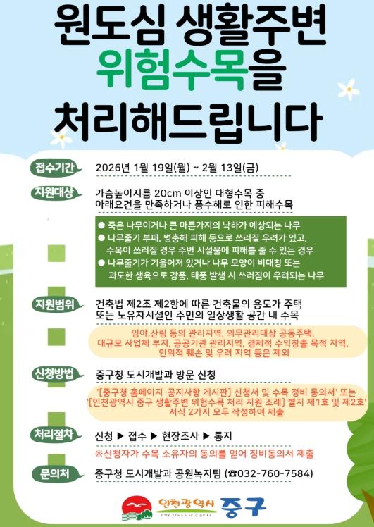 인천시 중구는 원도심 권역을 대상으로 ‘2026년도 원도심 생활 주변 위험 수목 처리지원 사업’을 추진한다고 21일 밝혔다.