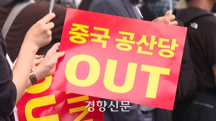 | 한 시민이 ‘중국 공산당 아웃(OUT)’이라고 적힌 피켓을 들고 있다. 경향신문 자료사진 |
