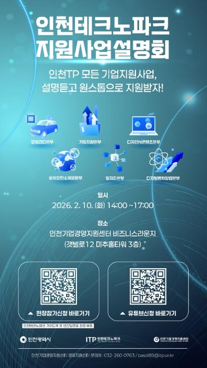 인천테크노파크(인천TP)는 오는 2월 10일 송도 미추홀타워에서 인천 지역 중소기업을 대상으로 ‘2026 인천테크노파크 지원사업 설명회’를 개최한다고 밝혔다.