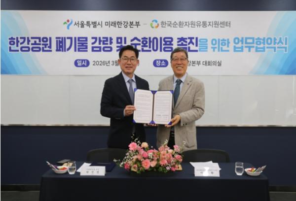 서울시 미래한강본부가 12일 한강공원 내 폐기물 감량 및 순환이용 촉진을 위해 폐기물 재활용 분야 전문기관인 한국순환자원유통지원센터(KOrea Resource circulation service Agency, KORA)와 업무협약을 체결했다.