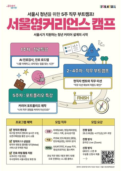 서울시가 대학교 재학생 대상 일 경험 지원사업인 ‘서울영커리언스 캠프(부트캠프)·챌린지(팀 공모전)’ 참여자 모집에 나선다. 올해 처음 선보이는 본 사업은 2월부터 모집기간을 거쳐 3월 프로그램 참여를 실시할 계획이다.